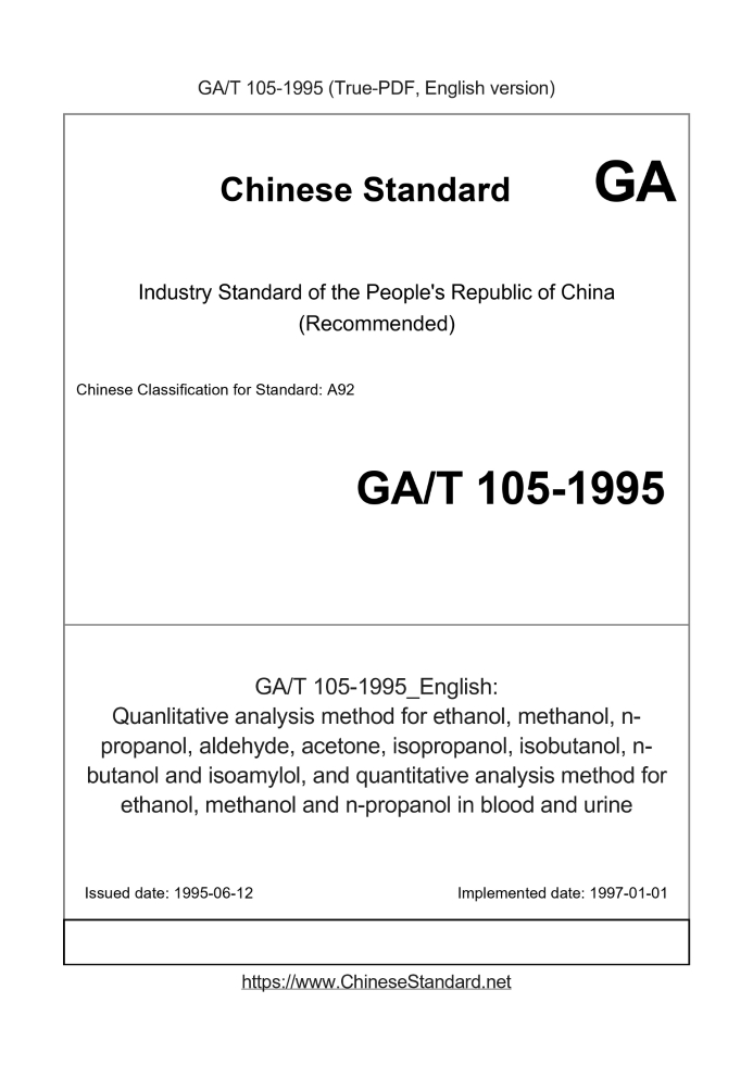 Delivery: <= 3 days. True-PDF full-copy in English will be manually translated and delivered via email. GA/T 105-1995: Quanlitative analysis method for ethanol, methanol, n-propanol, aldehyde, acetone, isopropanol, isobutanol, n-butanol and isoamylol, and quantitative analysis method for ethanol, methanol and n-propanol in blood and urine Status: Obsolete