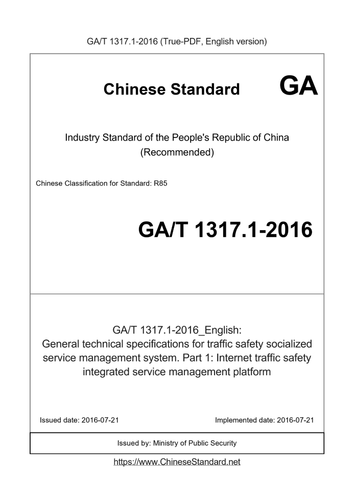 Delivery: <= 5 days. True-PDF full-copy in English will be manually translated and delivered via email. GA/T 1317.1-2016: General technical specifications for traffic safety socialized service management system. Part 1: Internet traffic safety integrated service management platform Status: Valid