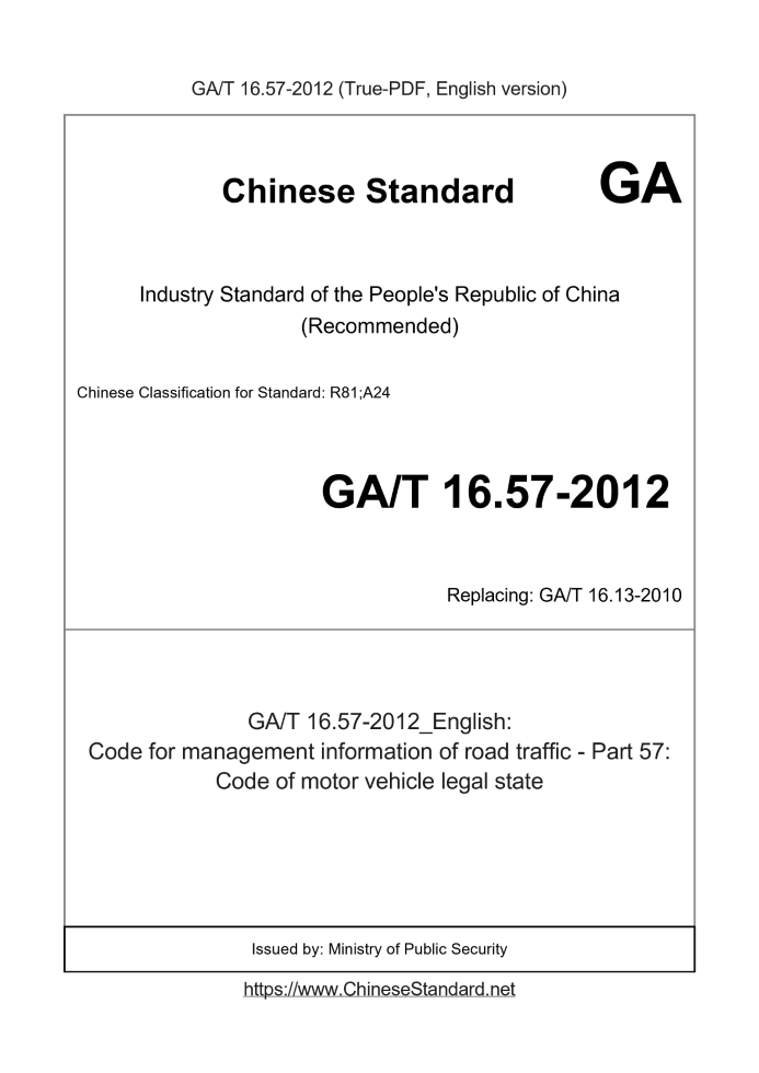 Basic dataStandard ID: GA/T 16.57-2012 (GA/T16.57-2012)Description (Translated English): Code for management information of road traffic - Part 57: Code of motor vehicle legal state Sector / Industry: Public Security (Police) Industry Standard (Recommended) Classification of Chinese Standard: R81;A24 Older Standard (superseded by this standard): GA/T 16.13-2010 Regulation (derived from): Announcement on Publication of Public Safety Industry Standard; Industry Standard Record Announcement No. 3 of 2013 (No. 159) Issuing agency(ies): Ministry of Public Security Tips & Frequently Asked Questions:Question 1: How long will the true-PDF of GA/T 16.57-2012_English be delivered?Answer: Upon your order, we will start to translate GA/T 16.57-2012_English as soon as possible, and keep you informed of the progress. The lead time is typically 1 ~ 3 working days. The lengthier the document the longer the lead time.Question 2: Can I share the purchased PDF of GA/T 16.57-2012_English with my colleagues?Answer: Yes. The purchased PDF of GA/T 16.57-2012_English will be deemed to be sold to your employer/organization who actually pays for it, including your colleagues and your employer's intranet.Question 3: Does the price include tax/VAT?Answer: Yes. Our tax invoice, downloaded/delivered in 9 seconds, includes all tax/VAT and complies with 100+ countries' tax regulations (tax exempted in 100+ countries) -- See Avoidance of Double Taxation Agreements (DTAs): List of DTAs signed between Singapore and 100+ countriesQuestion 4: Do you accept my currency other than USD?Answer: Yes. If you need your currency to be printed on the invoice, please write an email to Sales@ChineseStandard.net. In 2 working-hours, we will create a special link for you to pay in any currencies. Otherwise, follow the normal steps: Add to Cart -- Checkout -- Select your currency to pay. |