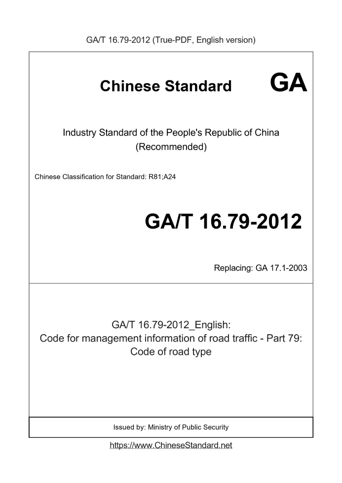 Basic dataStandard ID: GA/T 16.79-2012 (GA/T16.79-2012)Description (Translated English): Code for management information of road traffic - Part 79: Code of road type Sector / Industry: Public Security (Police) Industry Standard (Recommended) Classification of Chinese Standard: R81;A24 Older Standard (superseded by this standard): GA 17.1-2003 Regulation (derived from): Announcement on Publication of Public Safety Industry Standard; Industry Standard Record Announcement No. 3 of 2013 (No. 159) Issuing agency(ies): Ministry of Public Security Tips & Frequently Asked Questions:Question 1: How long will the true-PDF of GA/T 16.79-2012_English be delivered?Answer: Upon your order, we will start to translate GA/T 16.79-2012_English as soon as possible, and keep you informed of the progress. The lead time is typically 1 ~ 3 working days. The lengthier the document the longer the lead time.Question 2: Can I share the purchased PDF of GA/T 16.79-2012_English with my colleagues?Answer: Yes. The purchased PDF of GA/T 16.79-2012_English will be deemed to be sold to your employer/organization who actually pays for it, including your colleagues and your employer's intranet.Question 3: Does the price include tax/VAT?Answer: Yes. Our tax invoice, downloaded/delivered in 9 seconds, includes all tax/VAT and complies with 100+ countries' tax regulations (tax exempted in 100+ countries) -- See Avoidance of Double Taxation Agreements (DTAs): List of DTAs signed between Singapore and 100+ countriesQuestion 4: Do you accept my currency other than USD?Answer: Yes. If you need your currency to be printed on the invoice, please write an email to Sales@ChineseStandard.net. In 2 working-hours, we will create a special link for you to pay in any currencies. Otherwise, follow the normal steps: Add to Cart -- Checkout -- Select your currency to pay. |