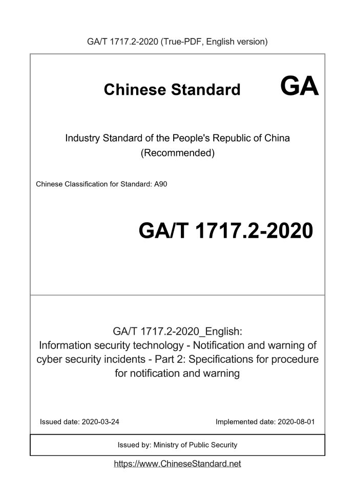 Delivery: <= 3 days. True-PDF full-copy in English will be manually translated and delivered via email. GA/T 1717.2-2020: Information security technology - Notification and warning of cyber security incidents - Part 2: Specifications for procedure for notification and warning Status: Valid