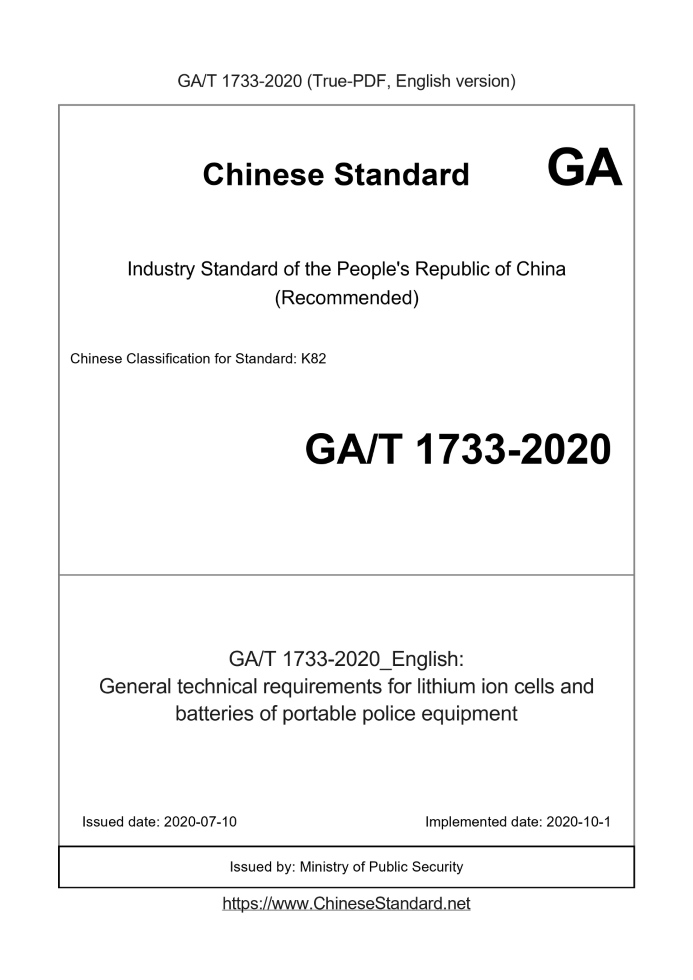 Delivery: <= 4 days. True-PDF full-copy in English will be manually translated and delivered via email. GA/T 1733-2020: General technical requirements for lithium ion cells and batteries of portable police equipment Status: Valid