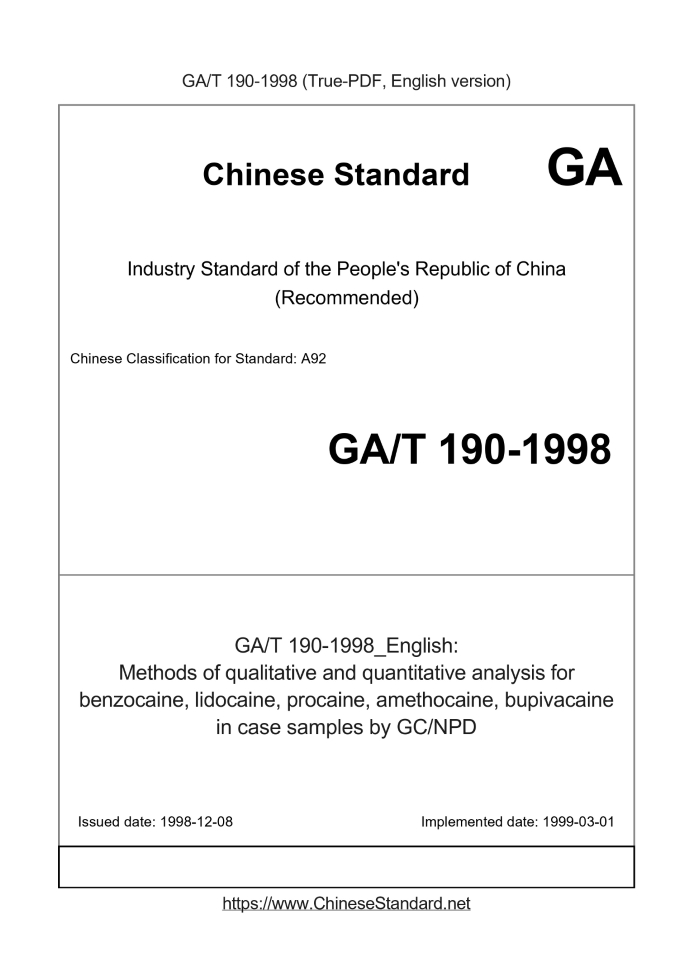Delivery: <= 3 days. True-PDF full-copy in English will be manually translated and delivered via email. GA/T 190-1998: Methods of qualitative and quantitative analysis for benzocaine, lidocaine, procaine, amethocaine, bupivacaine in case samples by GC/NPD Status: Obsolete