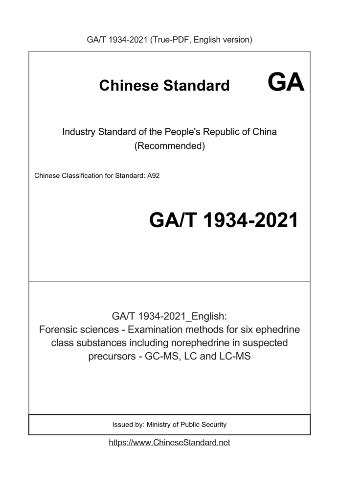 Delivery: <= 4 days. True-PDF full-copy in English will be manually translated and delivered via email. GA/T 1934-2021: Forensic sciences - Examination methods for six ephedrine class substances including norephedrine in suspected precursors - GC-MS, LC and LC-MS Status: Valid