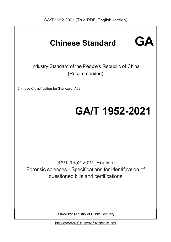 | GA/T 1952-2021 English PDFUS$179.00 ยท In stock Delivery: <= 3 days. True-PDF full-copy in English will be manually translated and delivered via email. GA/T 1952-2021: Forensic sciences - Specifications for identification of questioned bills and certifications Status: Valid