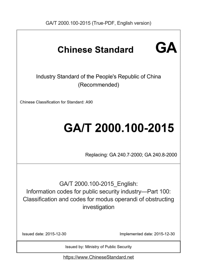 Delivery: <= 3 days. True-PDF full-copy in English will be manually translated and delivered via email. GA/T 2000.100-2015: Information codes for public security industry—Part 100: Classification and codes for modus operandi of obstructing investigation