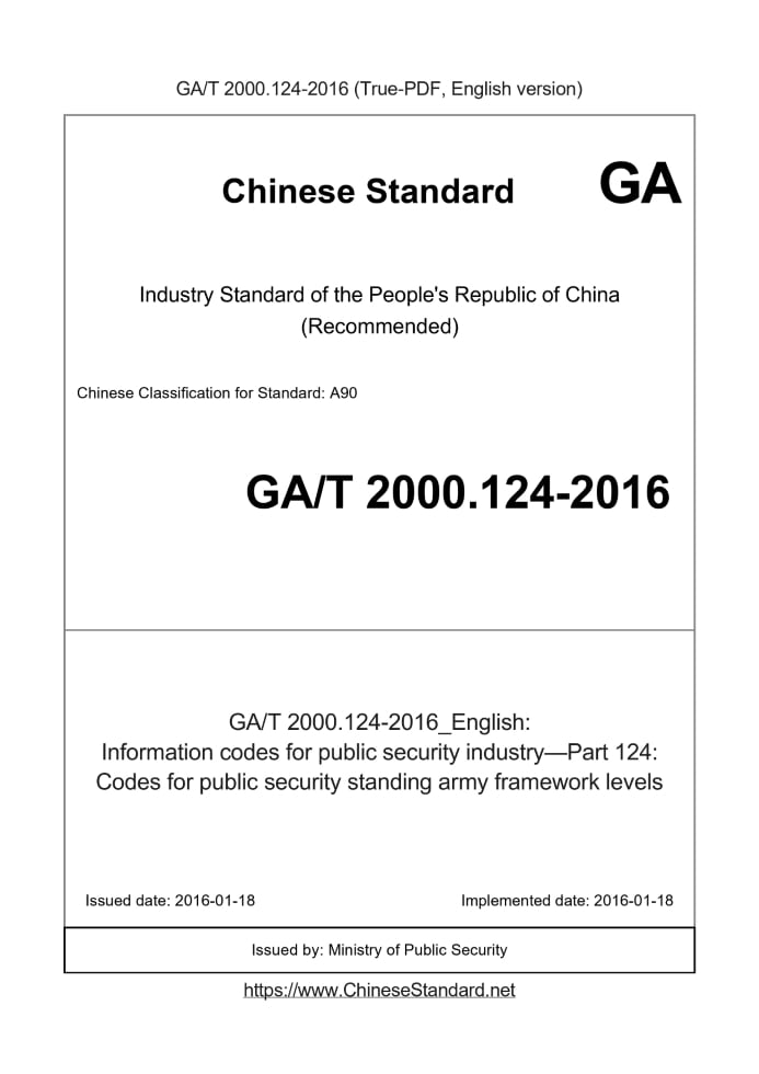 Delivery: <= 3 days. True-PDF full-copy in English will be manually translated and delivered via email. GA/T 2000.124-2016: Information codes for public security industry—Part 124: Codes for public security standing army framework levels