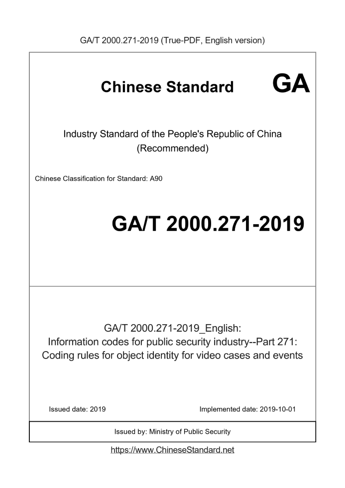 Delivery: <= 3 days. True-PDF full-copy in English will be manually translated and delivered via email. GA/T 2000.271-2019: Information codes for public security industry--Part 271: Coding rules for object identity for video cases and events Status: Valid