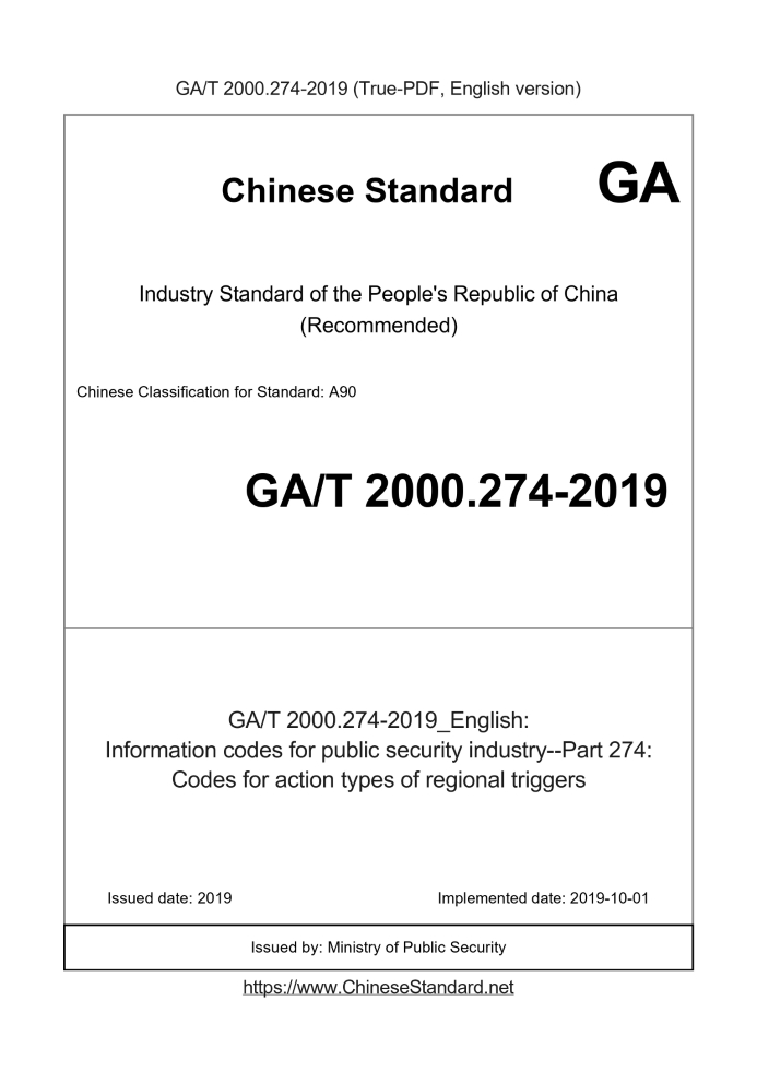Delivery: <= 3 days. True-PDF full-copy in English will be manually translated and delivered via email. GA/T 2000.274-2019: Information codes for public security industry--Part 274: Codes for action types of regional triggers Status: Valid