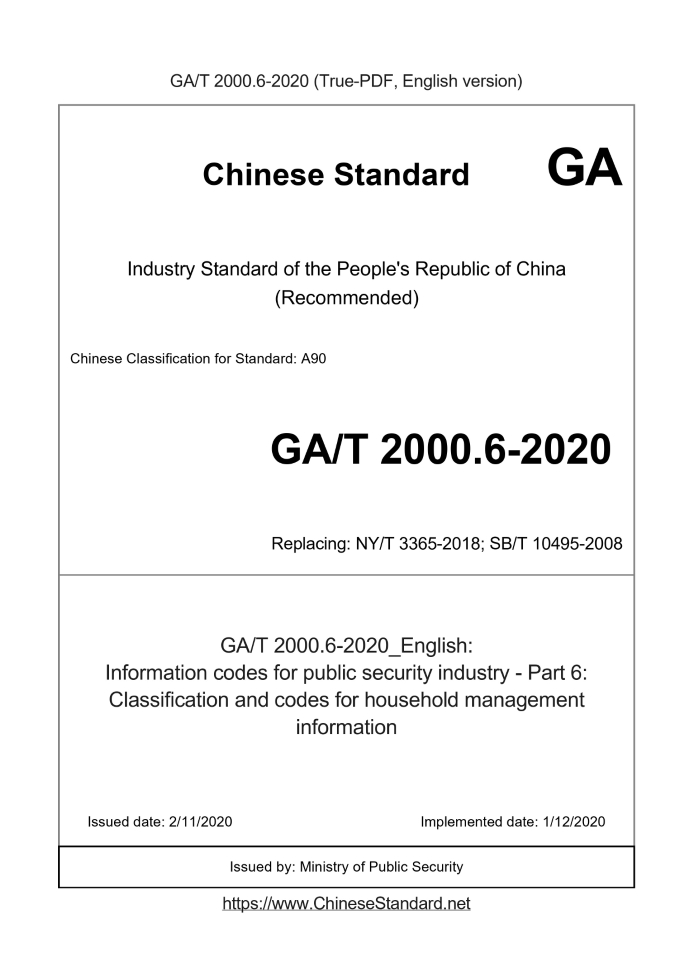 Delivery: <= 3 days. True-PDF full-copy in English will be manually translated and delivered via email. GA/T 2000.6-2020: Information codes for public security industry - Part 6: Classification and codes for household management information Status: Valid GA/T 2000.6: Historical versions