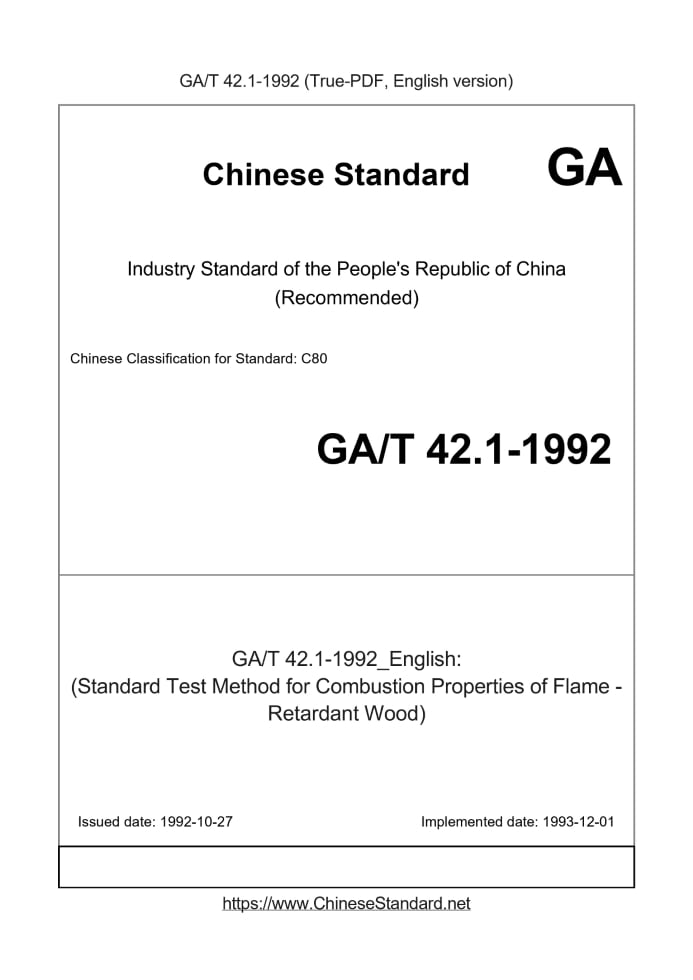Delivery: <= 3 days. True-PDF full-copy in English will be manually translated and delivered via email. GA/T 42.1-1992: (Standard Test Method for Combustion Properties of Flame - Retardant Wood) Status: Obsolete
