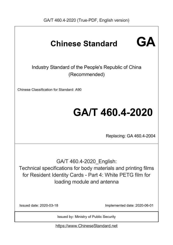 Delivery: <= 3 days. True-PDF full-copy in English will be manually translated and delivered via email. GA/T 460.4-2020: Technical specifications for body materials and printing films for Resident Identity Cards - Part 4: White PETG film for loading module and antenna Status: Valid GA/T 460.4: Historical versions