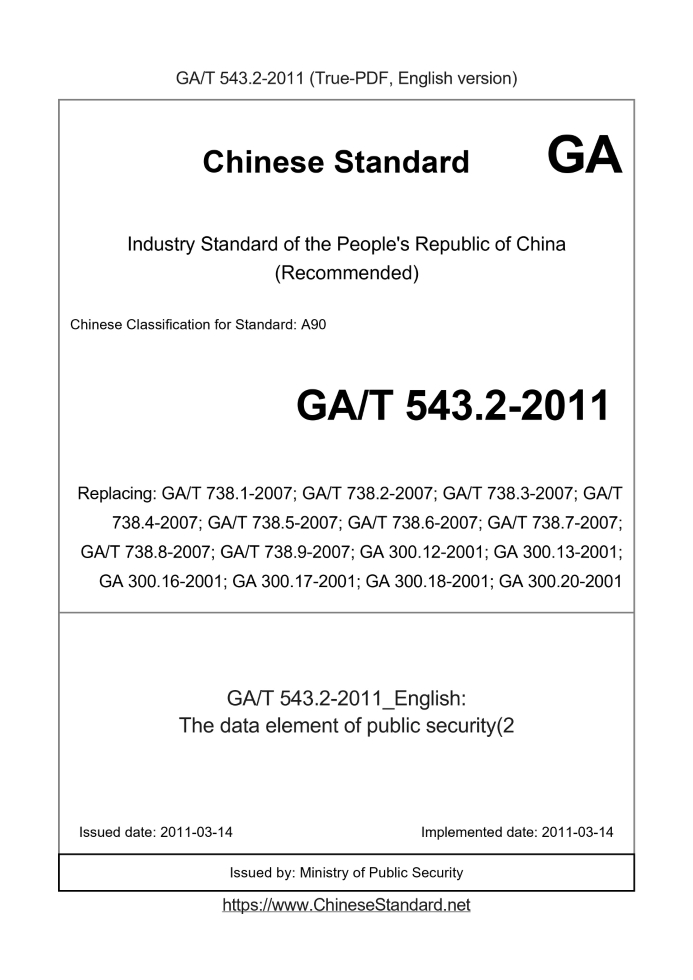 Delivery: <= 4 days. True-PDF full-copy in English will be manually translated and delivered via email. GA/T 543.2-2011: The data element of public security(2