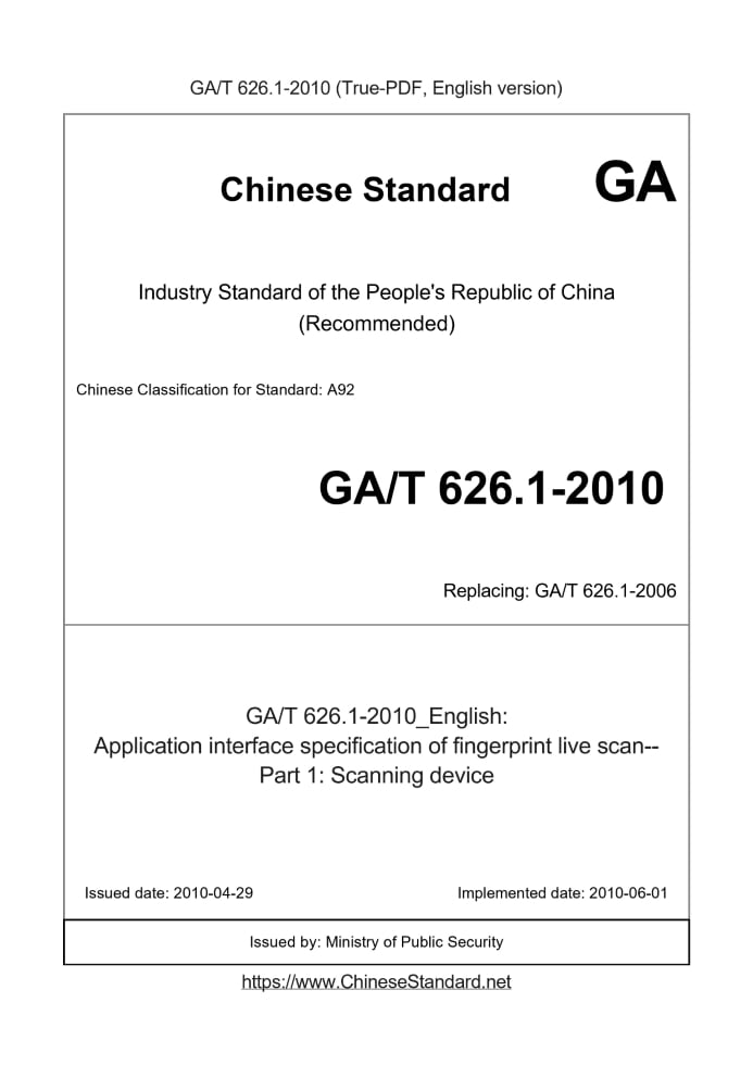Delivery: <= 3 days. True-PDF full-copy in English will be manually translated and delivered via email. GA/T 626.1-2010: Application interface specification of fingerprint live scan--Part 1: Scanning device GA/T 626.1: Historical versions