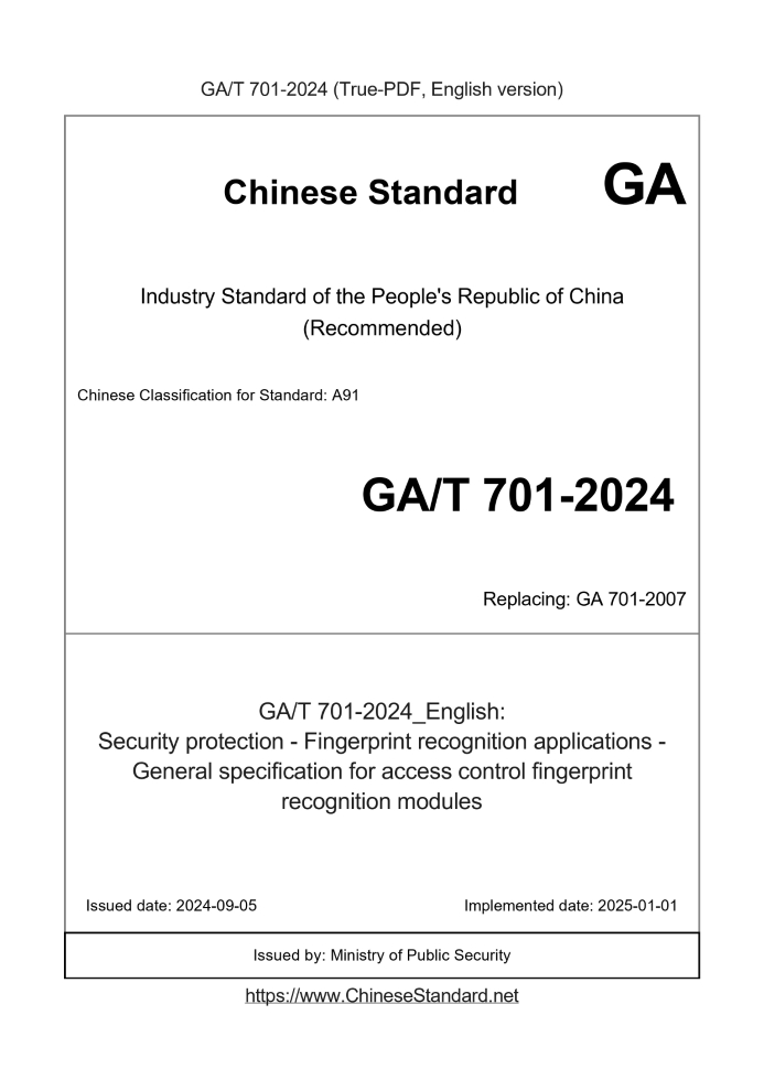 Delivery: <= 5 days. True-PDF full-copy in English will be manually translated and delivered via email. GA/T 701-2024: Security protection - Fingerprint recognition applications - General specification for access control fingerprint recognition modules Status: Valid GA/T 701: Historical versions