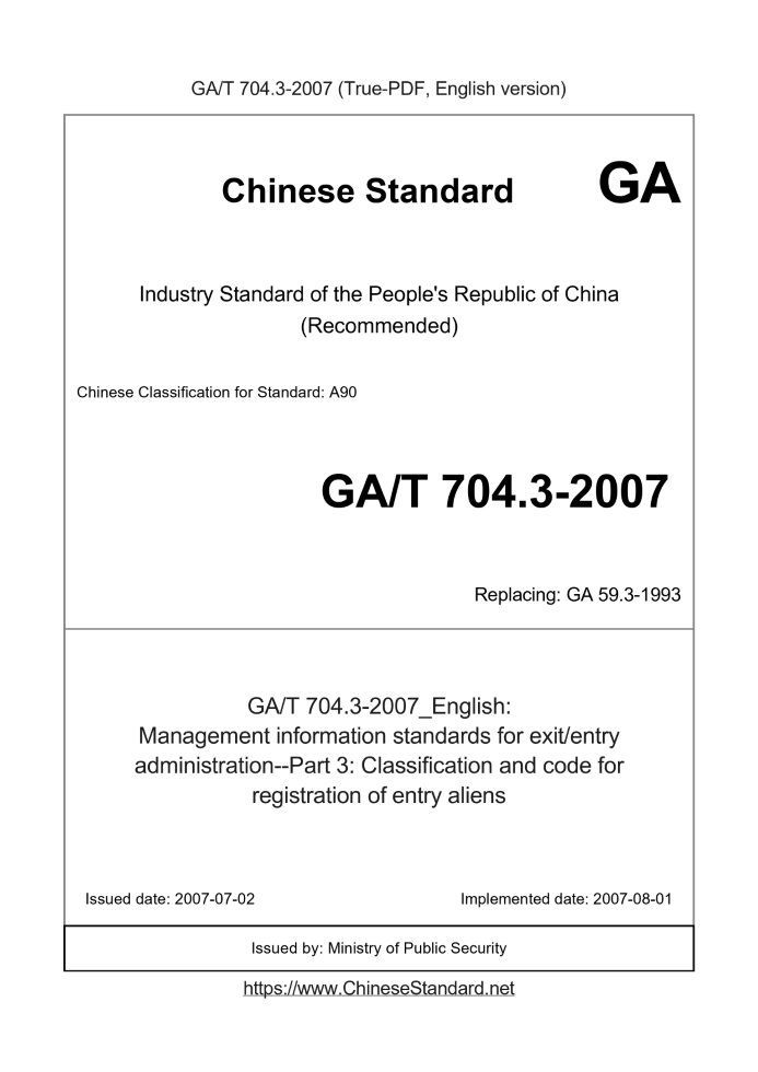 Basic dataStandard ID: GA/T 704.3-2007 (GA/T704.3-2007)Description (Translated English): Management information standards for exit/entry administration--Part 3: Classification and code for registration of entry aliens Sector / Industry: Public Security (Police) Industry Standard (Recommended) Classification of Chinese Standard: A90 Classification of International Standard: 35.040 Word Count Estimation: 5,543 Date of Issue: 2007-07-02 Date of Implementation: 2007-08-01 Older Standard (superseded by this standard): GA 59.3-1993 Issuing agency(ies): Ministry of Public Security Summary: This standard specifies the classification and code of the immigration registration status. This standard applies to management and exchange of public security immigration management information. Tips & Frequently Asked Questions:Question 1: How long will the true-PDF of GA/T 704.3-2007_English be delivered?Answer: Upon your order, we will start to translate GA/T 704.3-2007_English as soon as possible, and keep you informed of the progress. The lead time is typically in 9 seconds (download/delivered in 9 seconds). The lengthier the document the longer the lead time.Question 2: Can I share the purchased PDF of GA/T 704.3-2007_English with my colleagues?Answer: Yes. The purchased PDF of GA/T 704.3-2007_English will be deemed to be sold to your employer/organization who actually pays for it, including your colleagues and your employer's intranet.Question 3: Does the price include tax/VAT?Answer: Yes. Our tax invoice, downloaded/delivered in 9 seconds, includes all tax/VAT and complies with 100+ countries' tax regulations (tax exempted in 100+ countries) -- See Avoidance of Double Taxation Agreements (DTAs): List of DTAs signed between Singapore and 100+ countriesQuestion 4: Do you accept my currency other than USD?Answer: Yes. If you need your currency to be printed on the invoice, please write an email to Sales@ChineseStandard.net. In 2 working-hours, we will create a special link for you to pay in any currencies. Otherwise, follow the normal steps: Add to Cart -- Checkout -- Select your currency to pay. |