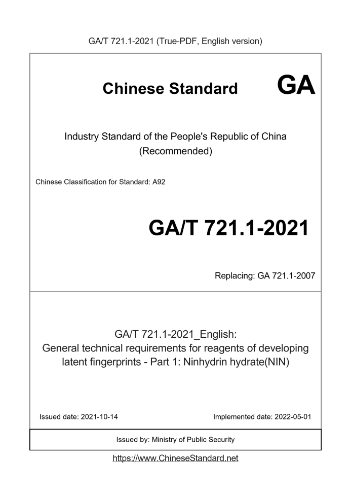 Delivery: <= 3 days. True-PDF full-copy in English will be manually translated and delivered via email. GA/T 721.1-2021: General technical requirements for reagents of developing latent fingerprints - Part 1: Ninhydrin hydrate(NIN) Status: Valid GA/T 721.1: Historical versions