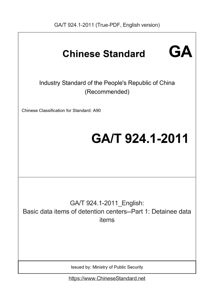 Delivery: <= 3 days. True-PDF full-copy in English will be manually translated and delivered via email. GA/T 924.1-2011: Basic data items of detention centers--Part 1: Detainee data items Status: Valid