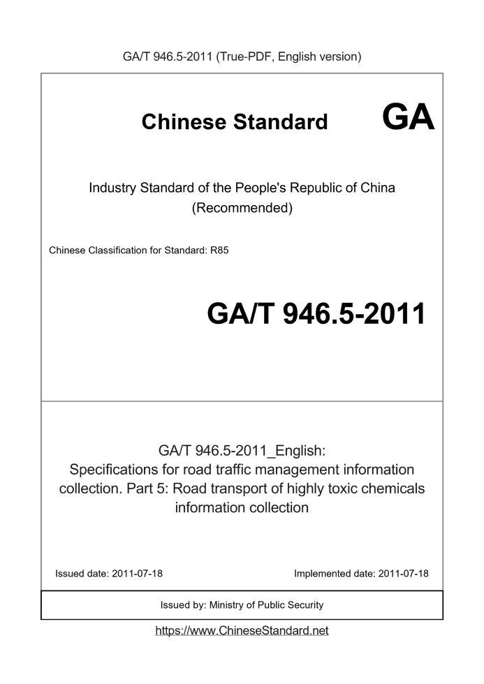 Delivery: <= 3 days. True-PDF full-copy in English will be manually translated and delivered via email. GA/T 946.5-2011: Specifications for road traffic management information collection. Part 5: Road transport of highly toxic chemicals information collection