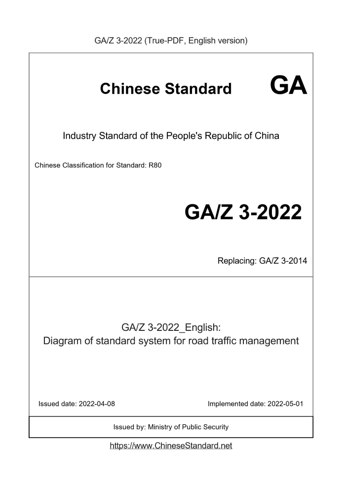 Basic dataStandard ID: GA/Z 3-2022 (GA/Z3-2022)Description (Translated English): Diagram of standard system for road traffic management Sector / Industry: Public Security (Police) Industry Standard Classification of Chinese Standard: R80 Classification of International Standard: 03.220.01 Word Count Estimation: 54,544 Date of Issue: 2022-04-08 Date of Implementation: 2022-05-01 Older Standard (superseded by this standard): GA/Z 3-2014 Issuing agency(ies): Ministry of Public Security Summary: This standard applies to the compilation and revision of road traffic management standards. GAZ3-2022: Diagram of standard system for road traffic management---This is a DRAFT version for illustration, not a final translation. Full copy of true-PDF in English version (including equations, symbols, images, flow-chart, tables, and figures etc.) will be manually/carefully translated upon your order.ICS03:220:01 CCSR80 Standardization Guiding Technical Documents of the Public Security Industry of the People's Republic of China Replace GA /Z3-2014 Road traffic management standard system table Released on 2022-04-08 2022-05-01 Implementation Released by the Ministry of Public Security of the People's Republic of China table of contentsPreface I 1 Scope 1 2 Normative references 1 3 Terms and Definitions 1 4 Standard Code Coding Rules 1 5 Road Traffic Management Standard Architecture 2 6 Standard Schedule 3 6:1 Basic Standard 3 6:1:1 Terms and symbols 3 6:1:2 General principles and guidelines 4 6:2 Technical and management standards 5 6:2:1 Traffic participant management 5 6:2:2 Vehicle operation safety 10 6:2:3 Traffic organization 15 6:2:4 Law enforcement on duty 23 6:2:5 Traffic accidents 29 6:2:6 Intelligent traffic management 34 7 Standard statistical tables 49forewordThis document is in accordance with the provisions of GB/T 1:1-2020 "Guidelines for Standardization Work Part 1: Structure and Drafting Rules for Standardization Documents" to be drafted: This document replaces GA /Z3-2014 "Road Traffic Management Standard System Table": Compared with GA /Z3-2014, except for structural adjustment and compilation In addition to editorial changes, the main technical changes are as follows: a) Changed the definition of the road traffic management standard system (see 3:1, 3:1 of the:2014 edition); b) Deleted the term basic standard (see 3:2 of the:2014 edition); c) Deleted the term technical standard (see 3:3 of the:2014 edition); d) Terminology management standard is deleted (see 3:4 of the:2014 edition); e) Changed the road traffic management standard system structure diagram (see Chapter 5, 5:1 of the:2014 edition); f) Deleted the road traffic management standard classification table (see 5:2 of the:2014 edition); g) Changed the content of the standard schedule (see Chapter 6, Chapter 6 of the:2014 edition); h) Deleted the preparation instructions (see Chapter 7 of the:2014 edition); i) The contents of the standard statistical tables have been changed (see Chapter 7, Chapter 8 of the:2014 edition): Please note that some contents of this document may refer to patents: The issuing agency of this document assumes no responsibility for identifying patents: This document is proposed and managed by the National Road Traffic Management Standardization Technical Committee (SAC/TC576): This document is drafted by: National Road Traffic Management Standardization Technical Committee, Ministry of Public Security Traffic Management Science Research Institute: The main drafters of this document: Wang Junji, Pan Hanzhong, Wang Changjun, Wang Xiaoyan, Ying Chaoyang, Qiu Hongtong, Sun Wei, Sun Xiuping: The release status of previous versions of this document and the documents it replaces are as follows: ---GA /Z3-2008; ---GA /Z3-2014; --- This is the third revision: Road traffic management standard system table1 ScopeThis document specifies the structure and basic content of the road traffic management standard system table: This document is applicable to the preparation and revision of road traffic management standards:2 Normative referencesThe contents of the following documents constitute the essential provisions of this document through normative references in the text: Among them, dated references For documents, only the version corresponding to the date is applicable to this document; for undated reference documents, the latest version (including all amendments) is applicable to this document: GA/T 1136-2014 Public Security Industry Standard System Table Compilation Rules3 Terms and DefinitionsThe following terms and definitions apply to this document: 3:1 Standards in road traffic management and related fields are a scientific organic whole formed by their internal relations:4 standard coding rulesIn the road traffic management standard system table, the standard code coding rules should meet the requirements of Chapter 7 of GA/T 1136-2014, such as Figure 1 shows: Figure 1 Public safety industry standard code coding rules The public safety industry standard code is divided into 8 layers, composed of Arabic numerals and letters, with a total of 13 digits: The specific instructions are as follows: The first layer: divided according to the standard category, represented by 1 digit as Arabic numerals: Among them: 1 means basic standard; 2 means technical standard; 3 ......Tips & Frequently Asked Questions:Question 1: How long will the true-PDF of GAZ3-2022_English be delivered?Answer: Upon your order, we will start to translate GAZ3-2022_English as soon as possible, and keep you informed of the progress. The lead time is typically 5 ~ 8 working days. The lengthier the document the longer the lead time.Question 2: Can I share the purchased PDF of GAZ3-2022_English with my colleagues?Answer: Yes. The purchased PDF of GAZ3-2022_English will be deemed to be sold to your employer/organization who actually pays for it, including your colleagues and your employer's intranet.Question 3: Does the price include tax/VAT?Answer: Y