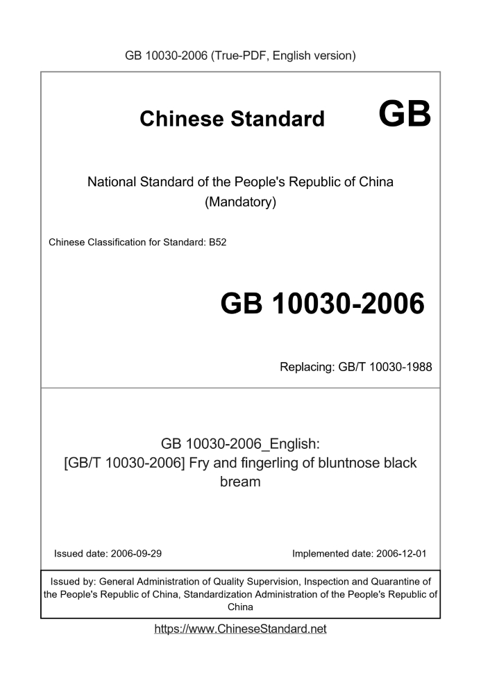 Delivery: <= 3 days. True-PDF full-copy in English will be manually translated and delivered via email. GB 10030-2006: [GB/T 10030-2006] Fry and fingerling of bluntnose black bream Status: Valid GB 10030: Historical versions