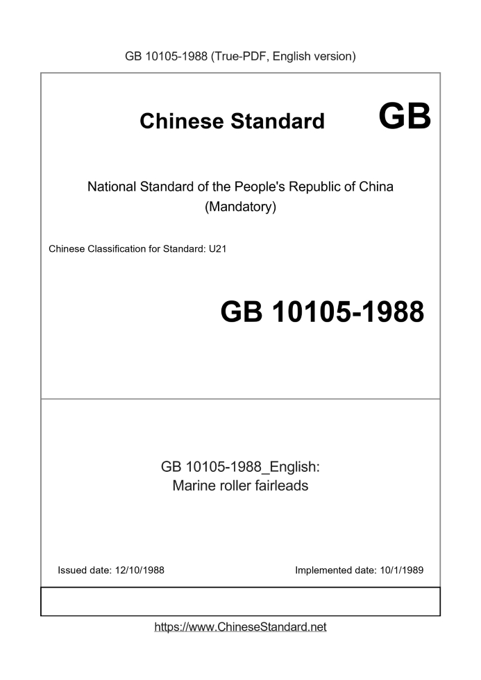 Delivery: <= 4 days. True-PDF full-copy in English will be manually translated and delivered via email. GB 10105-1988: Marine roller fairleads Status: Obsolete