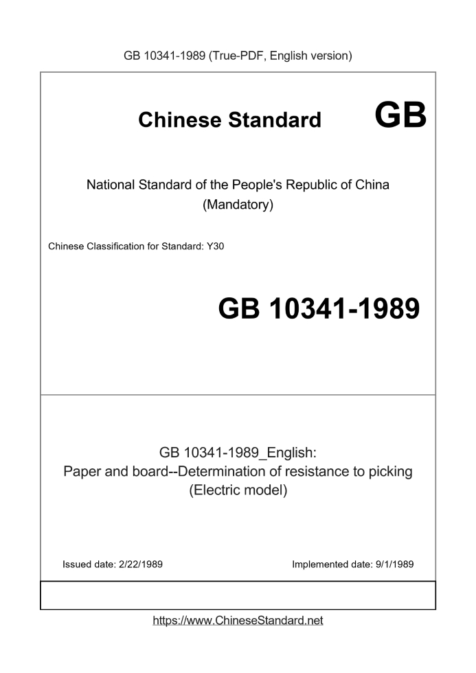 Delivery: <= 2 days. True-PDF full-copy in English will be manually translated and delivered via email. GB 10341-1989: Paper and board--Determination of resistance to picking (Electric model) Status: Obsolete