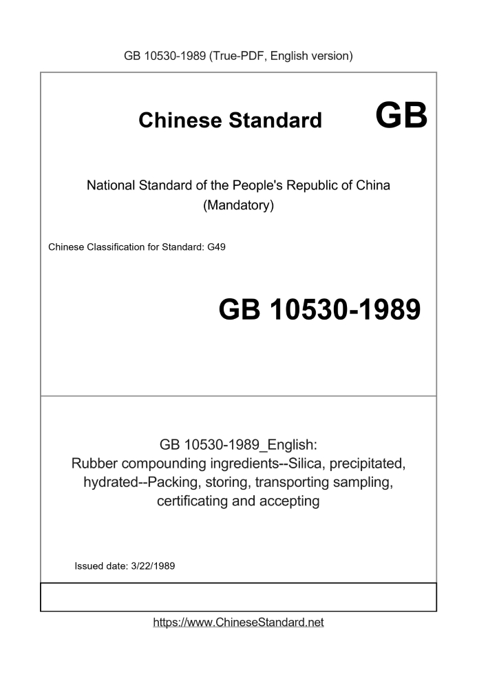 Delivery: <= 2 days. True-PDF full-copy in English will be manually translated and delivered via email. GB 10530-1989: Rubber compounding ingredients--Silica, precipitated, hydrated--Packing, storing, transporting sampling, certificating and accepting Status: Obsolete