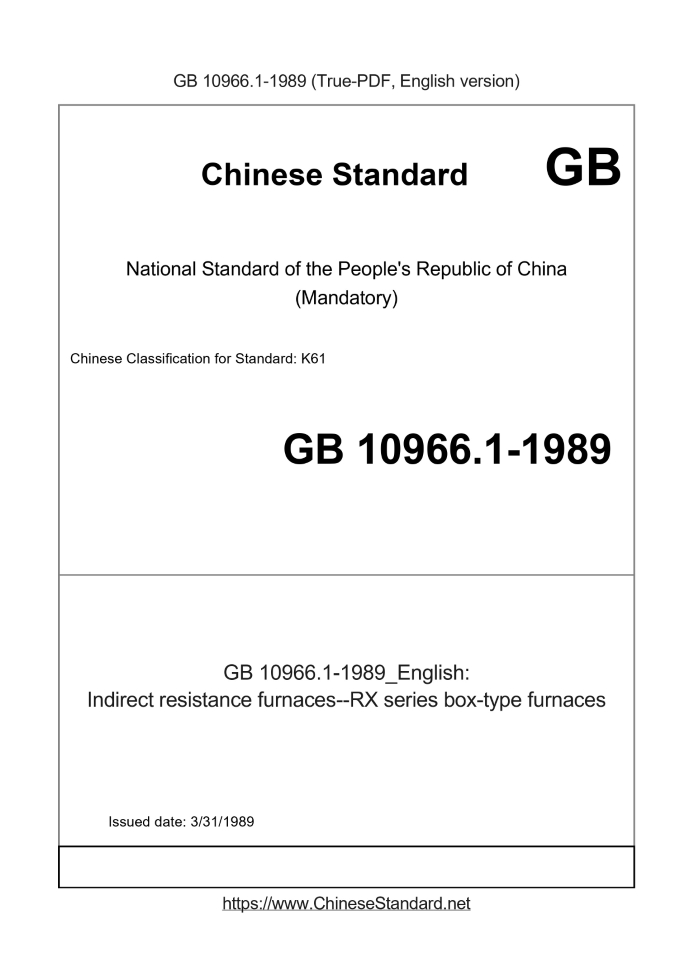 Delivery: <= 4 days. True-PDF full-copy in English will be manually translated and delivered via email. GB 10966.1-1989: Indirect resistance furnaces--RX series box-type furnaces Status: Obsolete