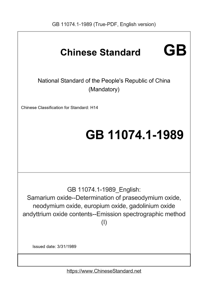 Standard ID: GB 11074.1-1989 (GB11074.1-1989)Description (Translated English): Samarium oxide--Determination of praseodymium oxide, neodymium oxide, europium oxide, gadolinium oxide andyttrium oxide contents--Emission spectrographic method (I)