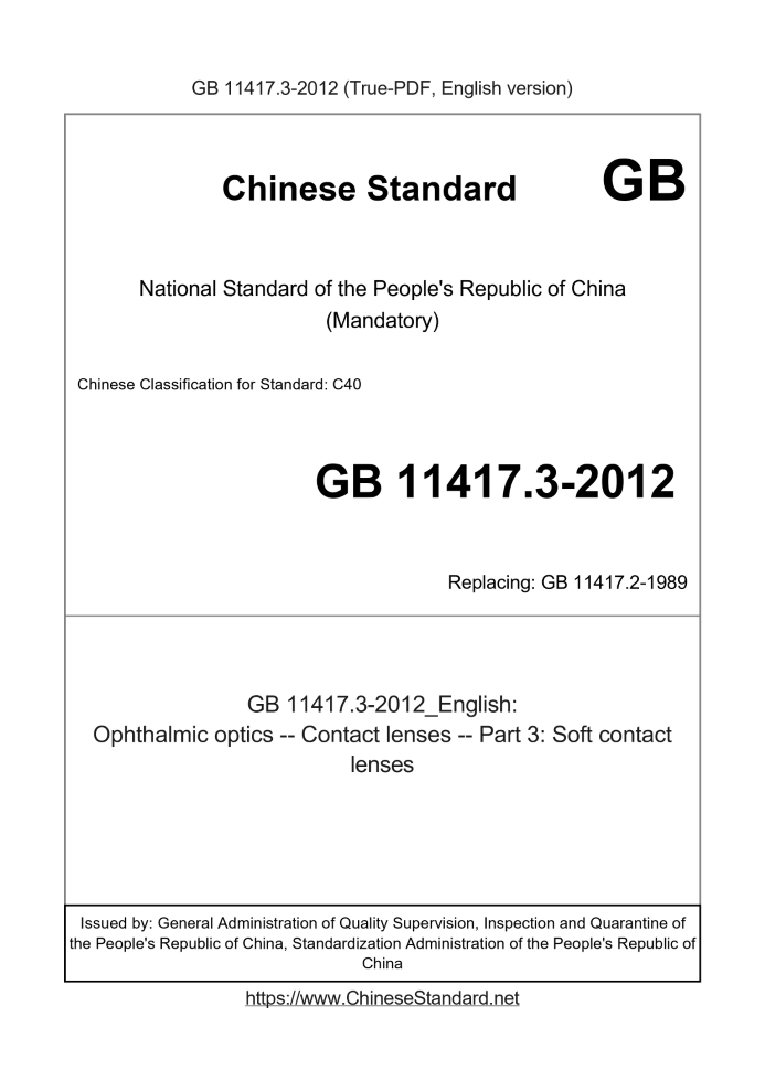 Delivery: <= 3 days. True-PDF full-copy in English will be manually translated and delivered via email. GB 11417.3-2012: Ophthalmic optics -- Contact lenses -- Part 3: Soft contact lenses Status: Valid