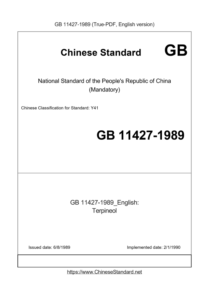 Delivery: <= 2 days. True-PDF full-copy in English will be manually translated and delivered via email. GB 11427-1989: Terpineol Status: Obsolete