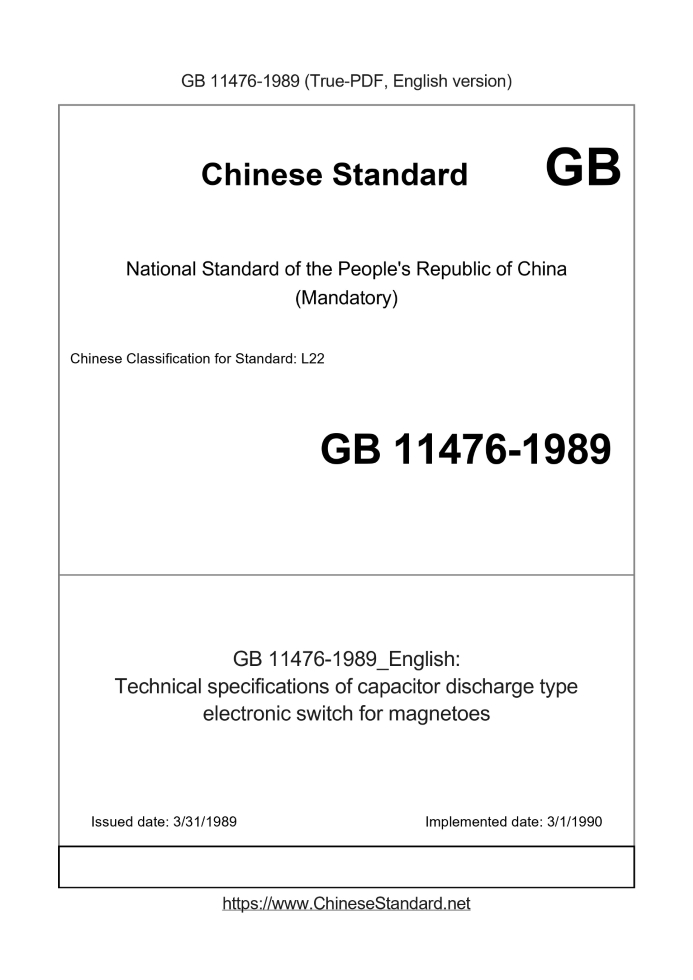 Delivery: <= 2 days. True-PDF full-copy in English will be manually translated and delivered via email. GB 11476-1989: Technical specifications of capacitor discharge type electronic switch for magnetoes Status: Obsolete