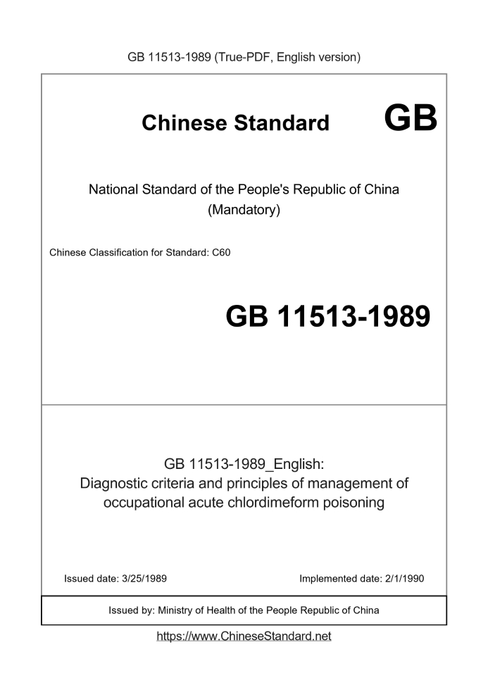 Delivery: <= 2 days. True-PDF full-copy in English will be manually translated and delivered via email. GB 11513-1989: Diagnostic criteria and principles of management of occupational acute chlordimeform poisoning Status: Obsolete
