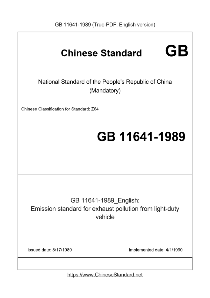 GB 11641-1989RFQ ASK 3 days Emission standard for exhaust pollution from light-duty vehicle Obsolete