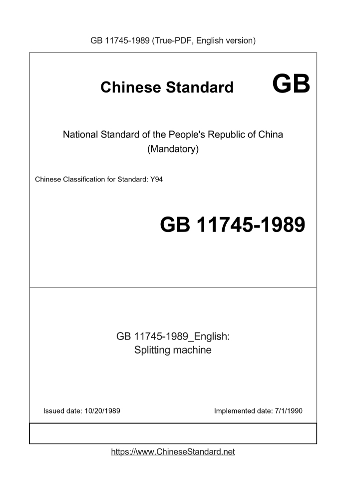 Delivery: <= 3 days. True-PDF full-copy in English will be manually translated and delivered via email. GB 11745-1989: Splitting machine Status: Obsolete