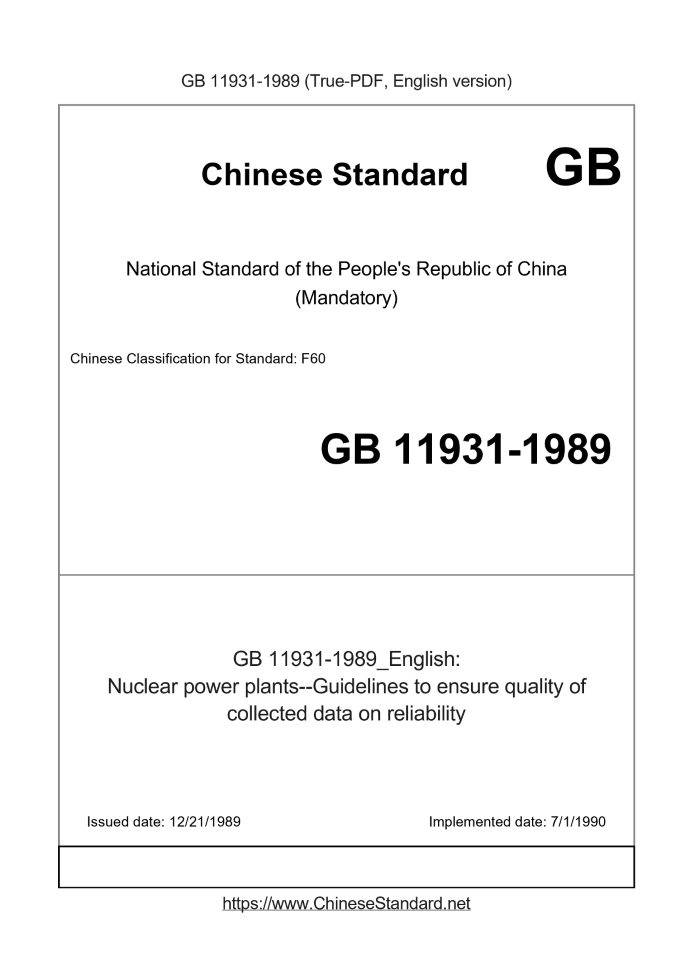 Delivery: <= 2 days. True-PDF full-copy in English will be manually translated and delivered via email. GB 11931-1989: Nuclear power plants--Guidelines to ensure quality of collected data on reliability Status: Obsolete