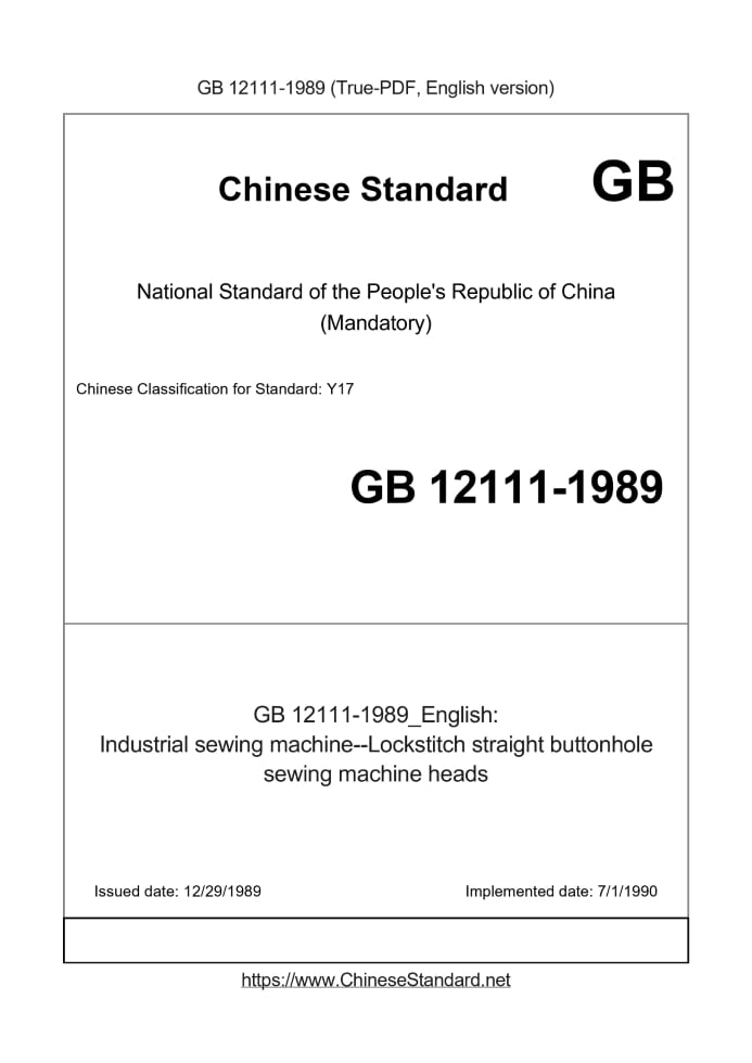 Delivery: <= 3 days. True-PDF full-copy in English will be manually translated and delivered via email. GB 12111-1989: Industrial sewing machine--Lockstitch straight buttonhole sewing machine heads Status: Obsolete