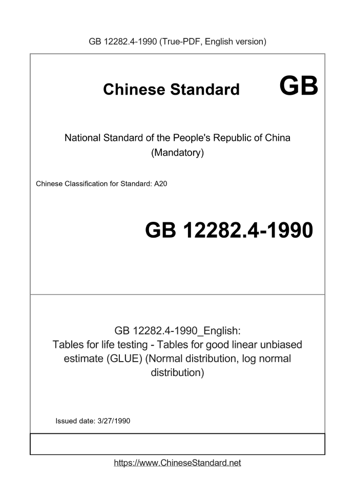 Basic dataStandard ID: GB 12282.4-1990 (GB12282.4-1990)Description (Translated English): Tables for life testing��Tables for good linear unbiased estimate (GLUE) (Normal distribution, log normaldistribution) Sector / Industry: National Standard Classification of Chinese Standard: A20 Date of Issue: 3/27/1990 Tips & Frequently Asked Questions:Question 1: How long will the true-PDF of GB 12282.4-1990_English be delivered?Answer: Upon your order, we will start to translate GB 12282.4-1990_English as soon as possible, and keep you informed of the progress. The lead time is typically 1 ~ 3 working days. The lengthier the document the longer the lead time.Question 2: Can I share the purchased PDF of GB 12282.4-1990_English with my colleagues?Answer: Yes. The purchased PDF of GB 12282.4-1990_English will be deemed to be sold to your employer/organization who actually pays for it, including your colleagues and your employer's intranet.Question 3: Does the price include tax/VAT?Answer: Yes. Our tax invoice, downloaded/delivered in 9 seconds, includes all tax/VAT and complies with 100+ countries' tax regulations (tax exempted in 100+ countries) -- See Avoidance of Double Taxation Agreements (DTAs): List of DTAs signed between Singapore and 100+ countriesQuestion 4: Do you accept my currency other than USD?Answer: Yes. If you need your currency to be printed on the invoice, please write an email to Sales@ChineseStandard.net. In 2 working-hours, we will create a special link for you to pay in any currencies. Otherwise, follow the normal steps: Add to Cart -- Checkout -- Select your currency to pay. |