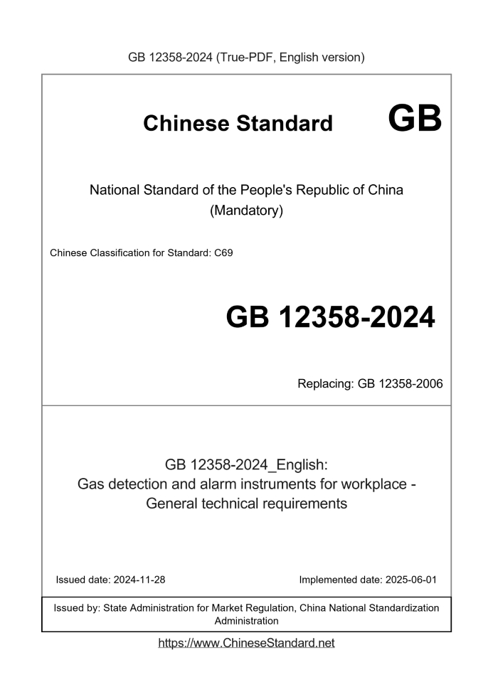 Delivery: <= 6 days. True-PDF full-copy in English will be manually translated and delivered via email. GB 12358-2024: Gas detection and alarm instruments for workplace - General technical requirements Status: Valid GB 12358: Historical versions