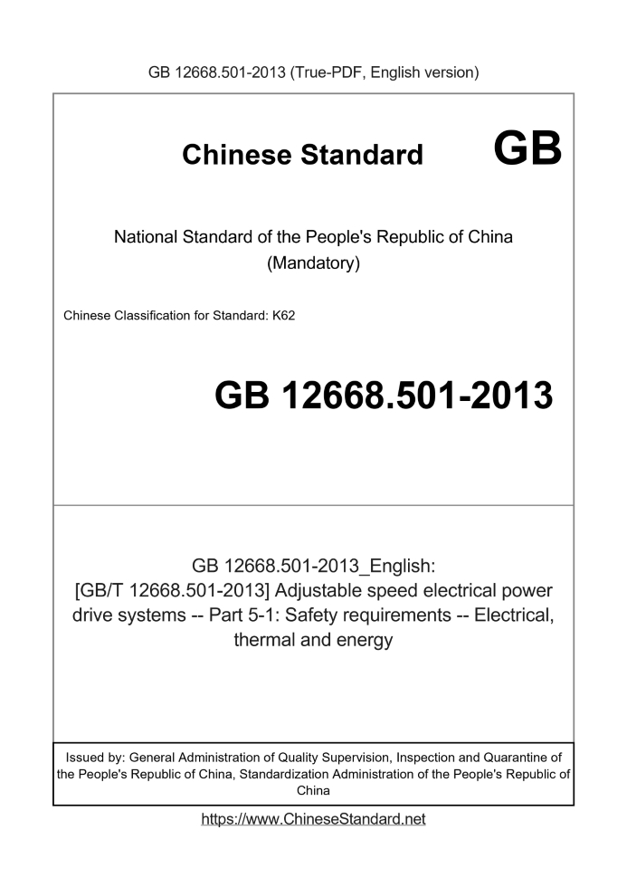 Delivery: <= 8 days. True-PDF full-copy in English will be manually translated and delivered via email. GB 12668.501-2013: [GB/T 12668.501-2013] Adjustable speed electrical power drive systems -- Part 5-1: Safety requirements -- Electrical, thermal and energy Status: Valid