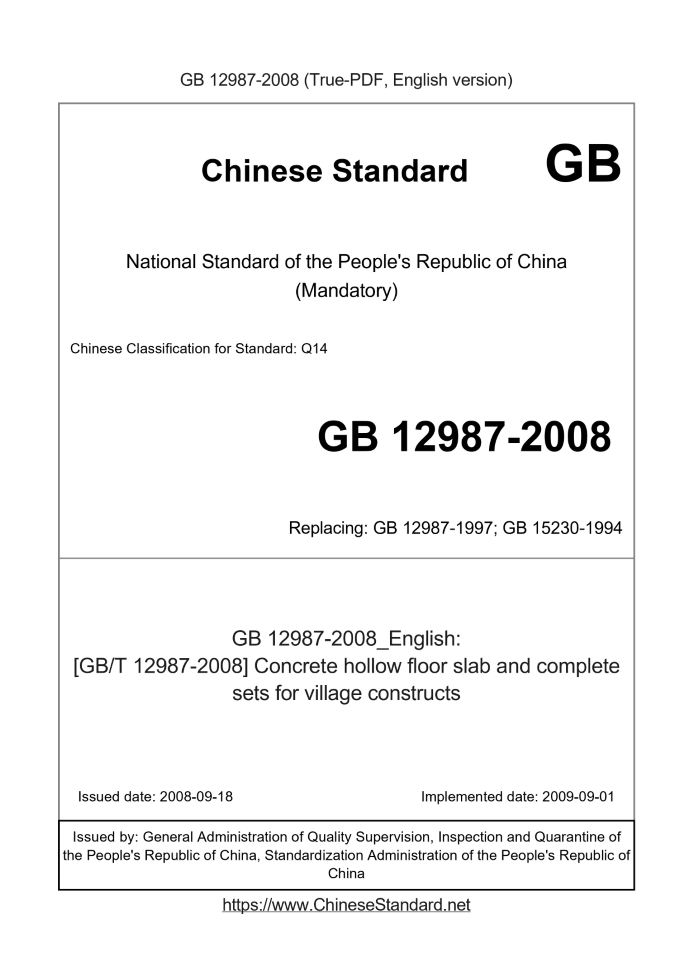 Delivery: <= 4 days. True-PDF full-copy in English will be manually translated and delivered via email. GB 12987-2008: [GB/T 12987-2008] Concrete hollow floor slab and complete sets for village constructs Status: Valid GB 12987: Historical versions