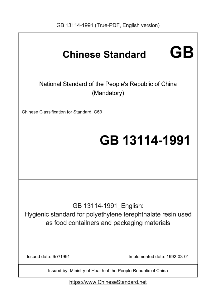 Delivery: <= 2 days. True-PDF full-copy in English will be manually translated and delivered via email. GB 13114-1991: Hygienic standard for polyethylene terephthalate resin used as food contailners and packaging materials Status: Obsolete