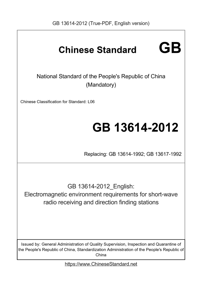 Electromagnetic environment requirements for short-wave radio receiving and direction finding stations ICS 33.100 L06 National Standards of People's Republic of China Replacing GB 13614-1992 and GB 13617-1992 Shortwave radio receiving station (station) and DF station (station) Electromagnetic environment requirements Issued on. 2012-06-29 2013-04-01 implementation Administration of Quality Supervision, Inspection and Quarantine of People's Republic of China Standardization Administration of China released
