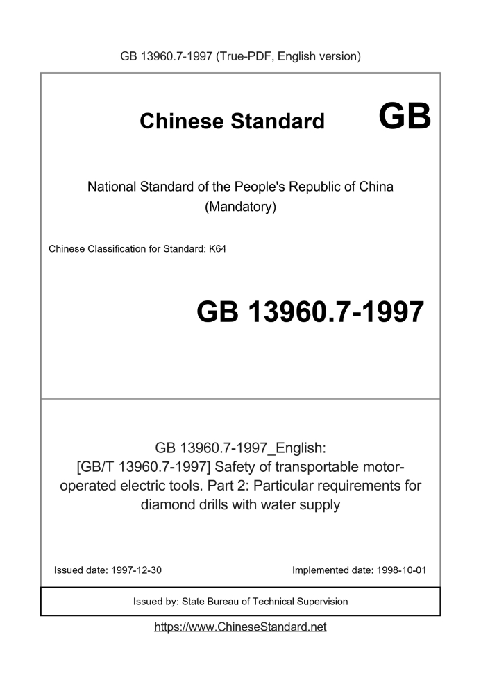 Delivery: <= 3 days. True-PDF full-copy in English will be manually translated and delivered via email. GB 13960.7-1997: [GB/T 13960.7-1997] Safety of transportable motor-operated electric tools. Part 2: Particular requirements for diamond drills with water supply Status: Obsolete