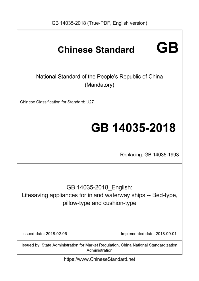 Delivery: <= 4 days. True-PDF full-copy in English will be manually translated and delivered via email. GB 14035-2018: Lifesaving appliances for inland waterway ships -- Bed-type, pillow-type and cushion-type Status: Valid GB 14035: Historical versions