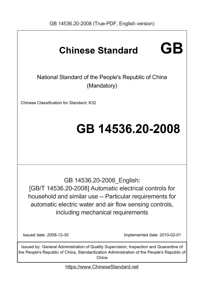 Delivery: <= 4 days. True-PDF full-copy in English will be manually translated and delivered via email. GB 14536.20-2008: [GB/T 14536.20-2008] Automatic electrical controls for household and similar use -- Particular requirements for automatic electric water and air flow sensing controls, including mechanical requirements Status: Valid