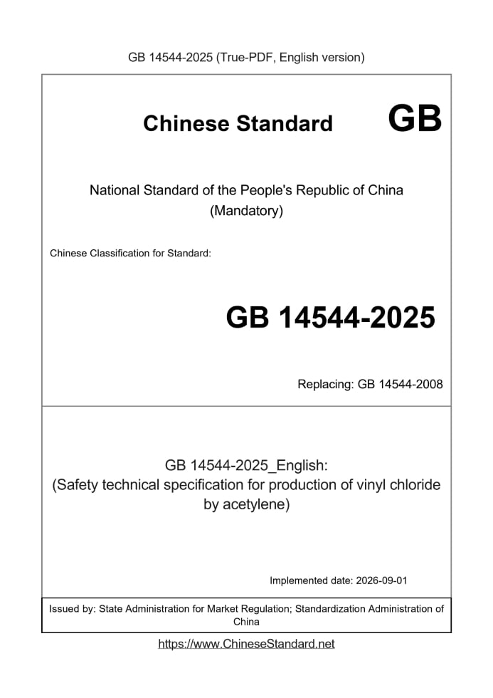 Basic dataStandard ID: GB 14544-2025 (GB14544-2025)Description (Translated English): (Safety technical specification for production of vinyl chloride by acetylene) Sector / Industry: National Standard Date of Implementation: 2026-09-01 Older Standard (superseded by this standard): GB 14544-2008 Issuing agency(ies): State Administration for Market Regulation; Standardization Administration of China GB 14544-2008: Production of vinyl chloride from calcium carbide and acetylene -- Safety technology code---This is a DRAFT version for illustration, not a final translation. Full copy of true-PDF in English version (including equations, symbols, images, flow-chart, tables, and figures etc.) will be manually/carefully translated upon your order. Production of vinyl chloride from calcium carbide and acetylene.Safety technology code ICS 13.300 A65 National Standards of People's Republic of China Replacing GB 14544-1993 Calcium carbide acetylene production Vinyl safety technology Posted 2008-12-23 2009-12-01 implementation Administration of Quality Supervision, Inspection and Quarantine of People's Republic of China Standardization Administration of China released ForewordThis standard 4.1.1,4.1.3,4.1.4,4.1.5,4.1.7,4.1.8,4.2.1,4.2.2, 4.3.1,4.3.2,4.4.1 ~ 4.4.4,4.5, 4.7.1 4.7.2,4.8.1 ~ ~ ~ 4.8.2,5.1.1,5.1.2,5.2.1 5.2.4,5. 2.6,5.2.7,5.3.2 ~ 5.3.6,5.4.1,5.4.3,5.4. 5.4.7,5.5 4 ~ ~ ~ 5.12,5.13.2,6.1,6.3.2,6.5.1 6.5.2,6.5.4, 6.5.5,6.5.7,6.6.1,6.6.3,7.2.1 ~ 7.2.2,7.3.1.1 ~ 7.3.1.2,7.3.2 mandatory, the rest are recommended. This standard replaces GB 14544-1993 "vinyl safety technology." The main difference compared with the standard GB 14544-1993 are as follows. --- According to the prior art to modify the standard name; --- Expanding the scope of the standard (see Chapter 1); --- Increasing the normative references (see Chapter 2); --- Redefined the term hot work (see 3.1) according to the prior art; --- Adds new, reform, expansion of vinyl chloride production unit associated security clearance requirements (see 4.1.1); --- Modified vinyl chloride production unit associated management of production safety agencies to set up and staffing requirements (see 4.1.4); --- The equipment inspection incorporated in subsequent chapters (1993 version 4.1.5, this version 5.8); --- Modify the use of safety signs, setting requirements (1993 version 4.1.6, this version 4.1.5); --- Modify the provisions of the pressure vessel aspects of (the 1993 version 4.1.7, this version 4.1.6); --- Information about the requirements of vinyl chloride Emergency Plan (this version 4.1.8); --- According to the prior art to modify the facilities of vinyl chloride and polyvinyl chloride fire apparatus requirements, and increased the alarm device to Request (see this edition 4.2); --- According to the prior art to modify the system and the electrical safety requirements of vinyl chloride polymerization system (see 4.3); --- According to the prior art to modify the lightning, anti-static grounding requirements (see 4.4); --- Canceled on liquids, gases, vinyl chloride flow provisions (1993 Version 4.4.4); --- According to the prior art to modify the design of ventilation PVC plant (see 4.5); --- According to the prior art to modify the job requires workers Personal protective equipment (the 1993 edition 4.7.2,8.1.2,9.2 present Version 4.7.2,7.3.1.2,8.2); --- According to the prior art to modify the workplace chloride concentration requirements (see 4.8.1); --- Increased use of PVC paste resin production safety requirements (see Chapter 4 ~ Chapter 8); --- According to the prior art to modify the new, reform, expansion of vinyl chloride related manufacturing enterprises area layout requirements (see 5.1.1); --- According to the prior art to modify the structure of the plant requirements and increases the proof requirements (see 5.1.2); --- According to the prior art to modify the management of materials in the control indicators (see 5.3.1); --- According to the prior art to modify the static grounding resistance of the vinyl chloride pipe system (see 5.4.2); --- According to the prior art modified synthetic mixer polymerizer fire, explosion-proof requirements (see 5.4.4); --- According to the prior art to modify the automatic control system of gas supply pneumatic instrumentation requirements (see 5.4.6); --- According to the prior art to modify the safety requirements of the controlled device (see 5.4.7); --- The autoclave was sticky and the removal of antifouling and as a (1993 edition 5.9,5.10, edition 5.9); --- Combined emergency measures emergency treatment is (the 1993 version 5.12, this version 5.11,5.12); --- According to the prior art modified vinyl chloride distillation tail exhaust gas emission standards (see 5.13.1); --- Increased piping requirements (edition 6.2); --- According to the prior art pipe laying revised requirements (1993 version 6.2, this version 6.3); --- Increasing the pipeline pressure test, and modify the pipeline leak test (1993 version 6.3, this version 6.4); --- According to the prior art modified vinyl chloride gas tank fire facility requirements (1993 version 6.4.1, this version 6.5.1); --- Increased liquid vinyl chloride pass into the gas tank of restrictions (the 1993 version 6.4.4, this version 6.5.4); --- The Chapters 7 and 8 combined into one chapter "Safety inspection and maintenance" (1993 edition Chapter 7, Chapter 8, Chapter 7 edition); --- According to the prior art modified vinyl chloride concentration allowable value kettle kettle job Qing (1993 version 8.1.1, this version 7.3.1.1); --- Increasing the number of vinyl chloride spill Accident (edition 8.5); --- Altered the safety management system (1993 version 10.3, this version 9.3); --- According to the prior art relates to amend the provisions of the 1211 fire extinguishing agent (see Appendix A). Appendix A of this standard is a normative appendix, Appendix B is an informative annex. This standard was proposed by the State Administration of Wor