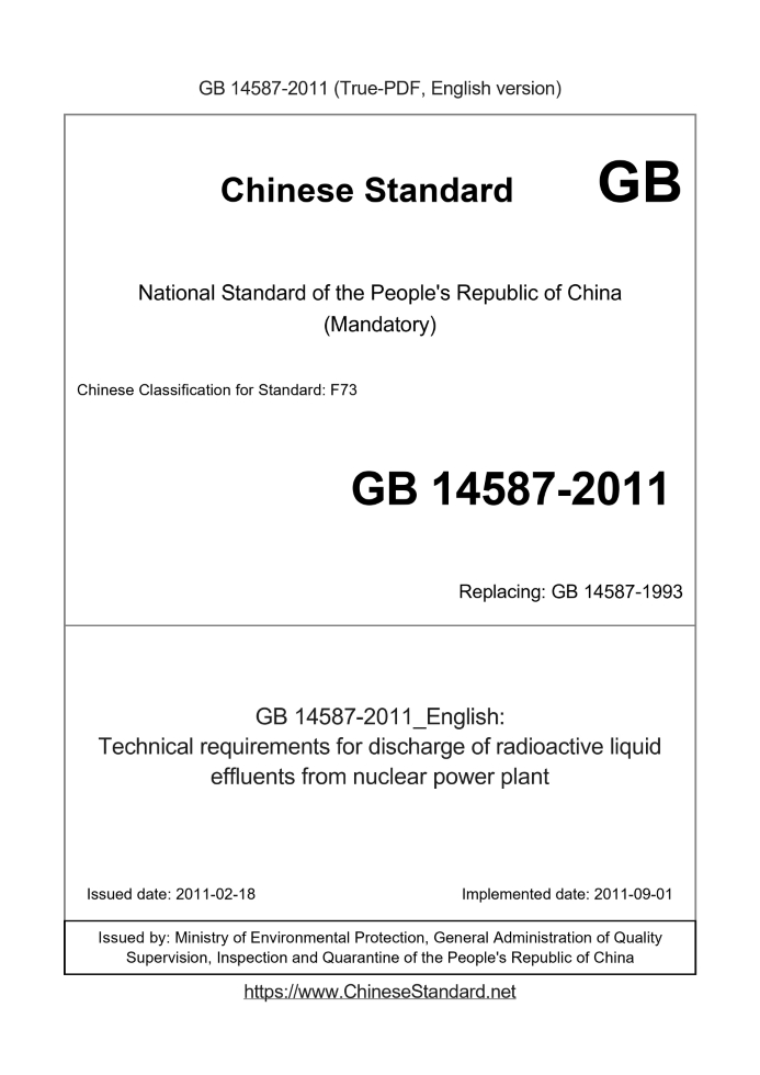 Delivery: <= 3 days. True-PDF full-copy in English will be manually translated and delivered via email. GB 14587-2011: Technical requirements for discharge of radioactive liquid effluents from nuclear power plant Status: Obsolete GB 14587: Historical versions