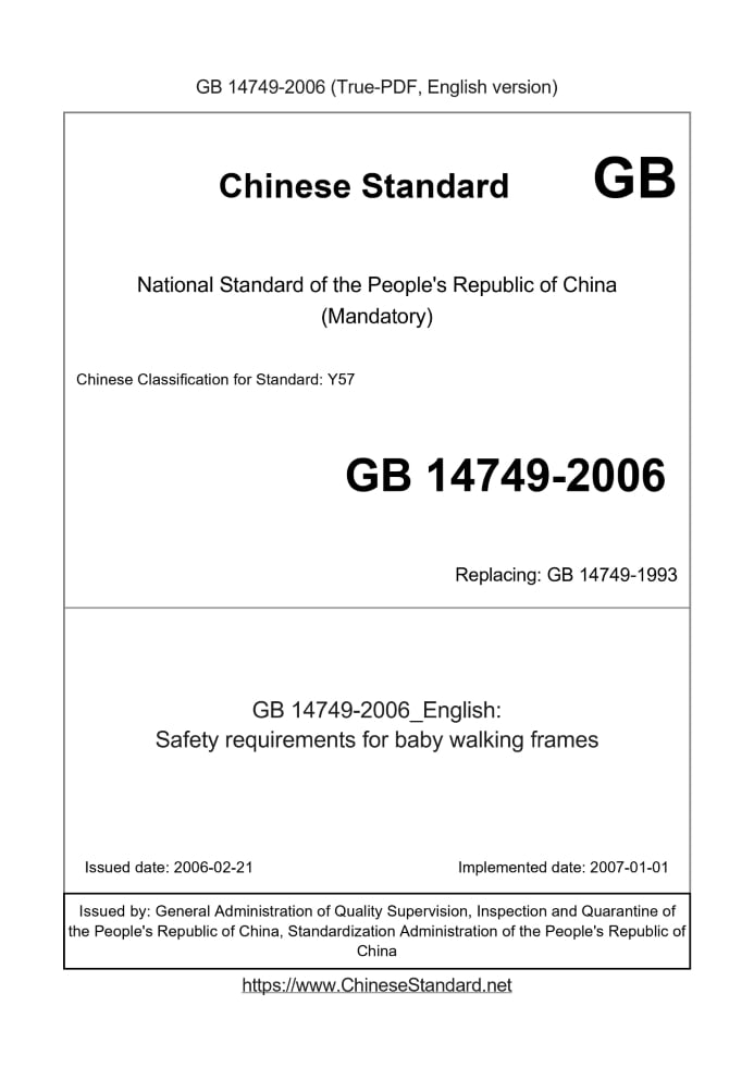 Delivery: <= 3 days. True-PDF full-copy in English will be manually translated and delivered via email. GB 14749-2006: Safety requirements for baby walking frames Status: Valid GB 14749: Historical versions